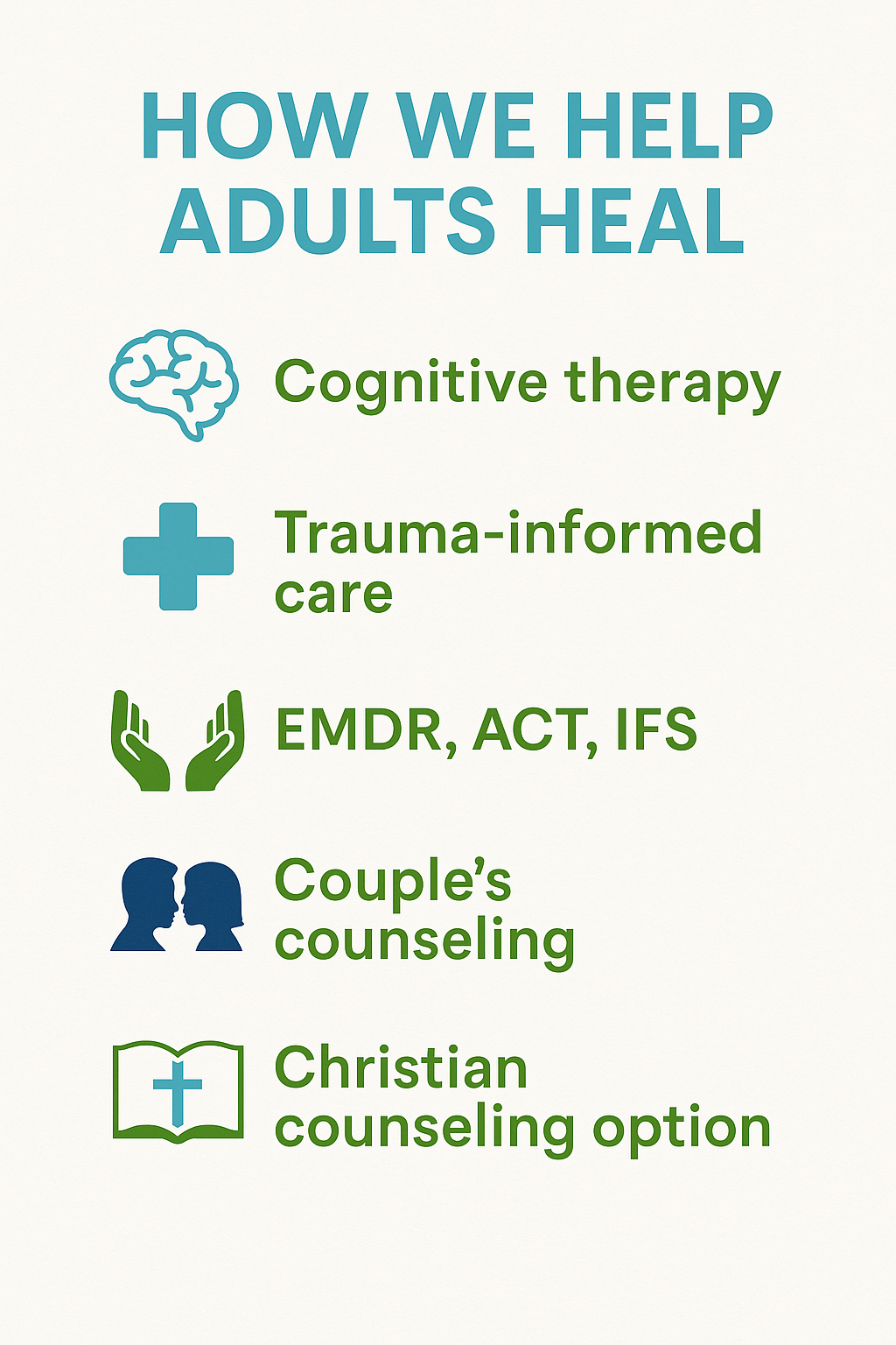 Our adult counseling therapists bring trauma-informed care and various areas of specialized experience and therapeutic methods to the adults they counsel.