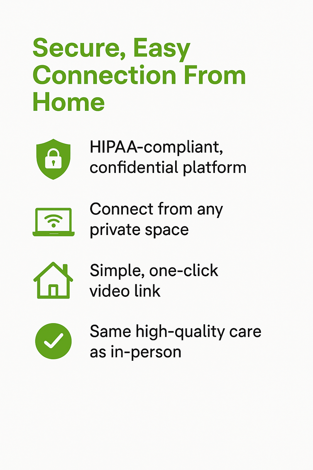 Save time traveling to and from an office to meet with your licensed mental health therapist. Connect from the comfort and privacy of your own home, and connect at a time when it's convenient for both you and your therapist.